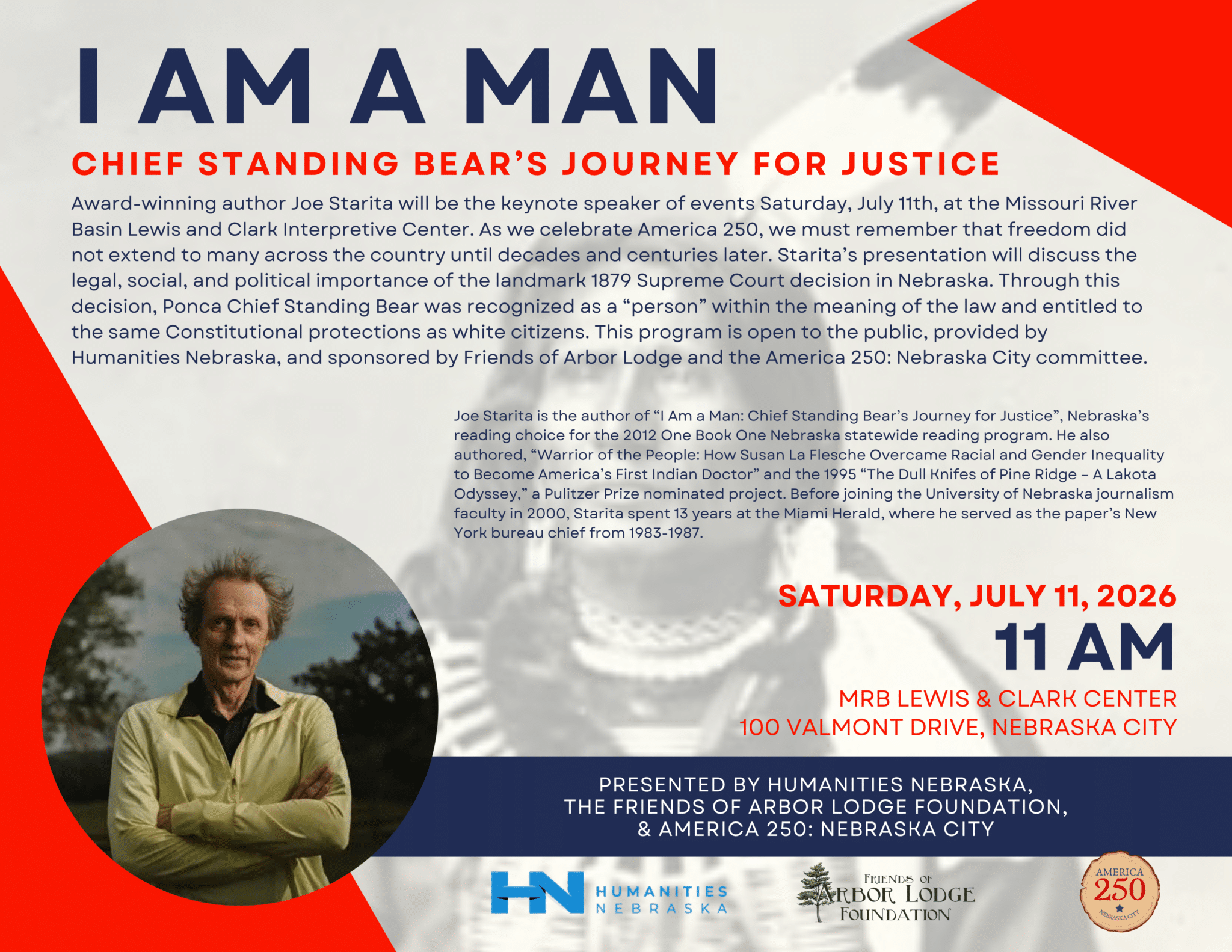 Award-winning author Joe Starita will be the keynote speaker of events on Saturday, July 11. Starita’s presentation will discuss the legal, social, and political importance of the landmark 1879 Supreme Court decision in Nebraska, in which Native Americans were recognized as persons within the meaning of the law for the first time in U.S. history.